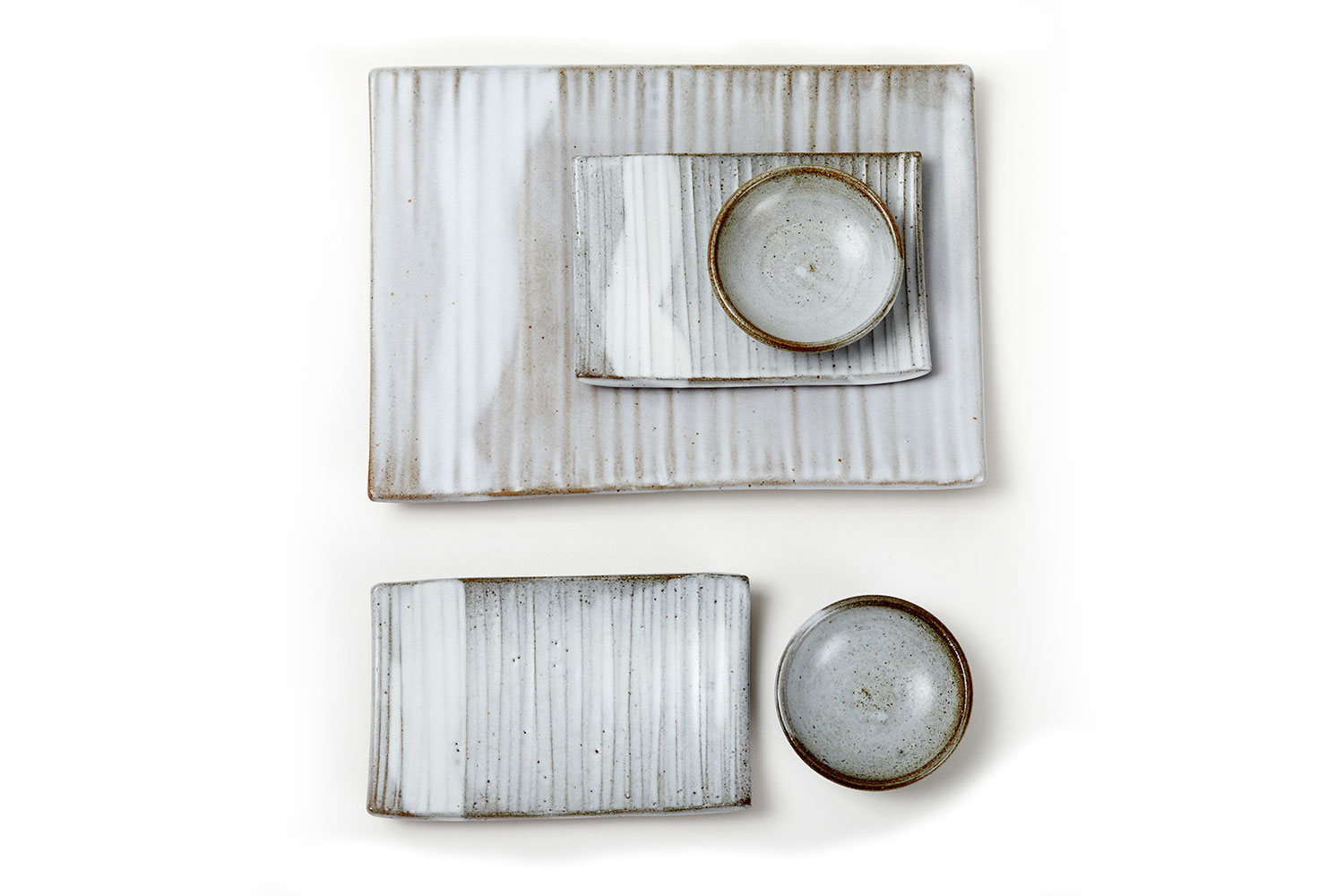 Conjunto com 1 Prato Risco G, 2 Pratos Risco PP e 2 Pratinhos Redondos para Shoyu com Pé