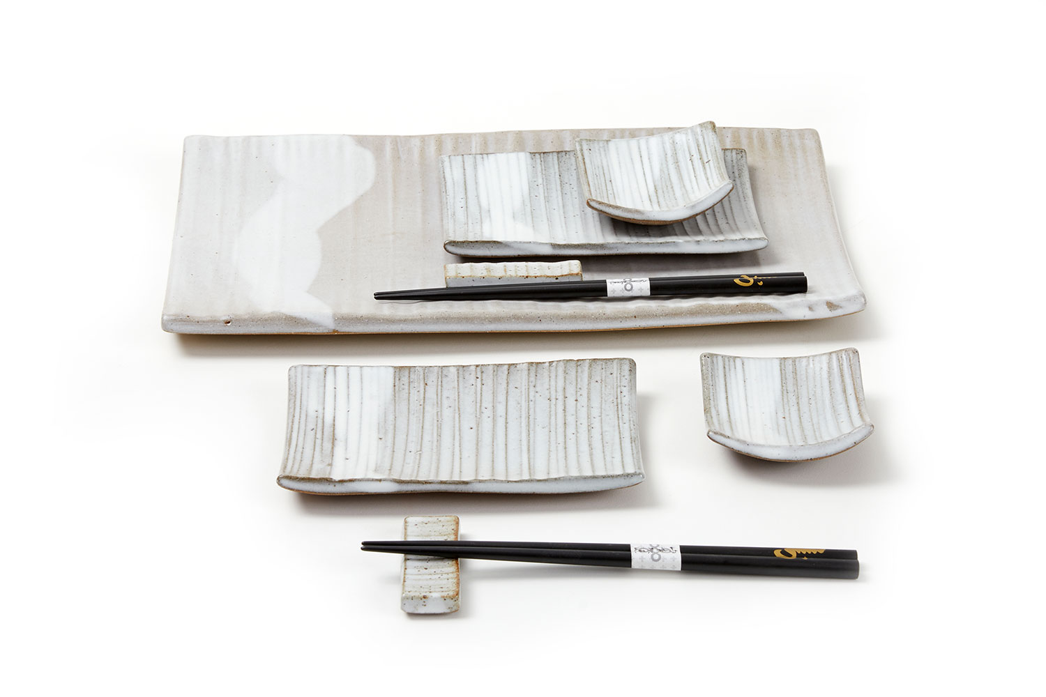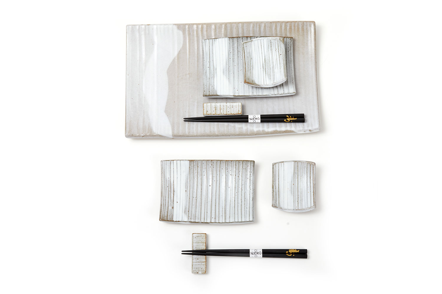 Conjunto com 1 Prato Risco G2, 2 Pratos Risco PP, 2 Pratos Risco Micro, 2 Apoiadores de Hashi Risco e 2 pares de hashis.