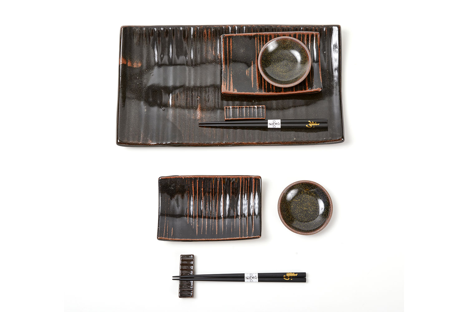 Conjunto com 1 Prato Risco GG, 2 Pratos Risco PP, 2 Pratinhos Redondos para Shoyu com Pé, 2 Apoiadores de Hashi Risco e 2 pares de hashis.